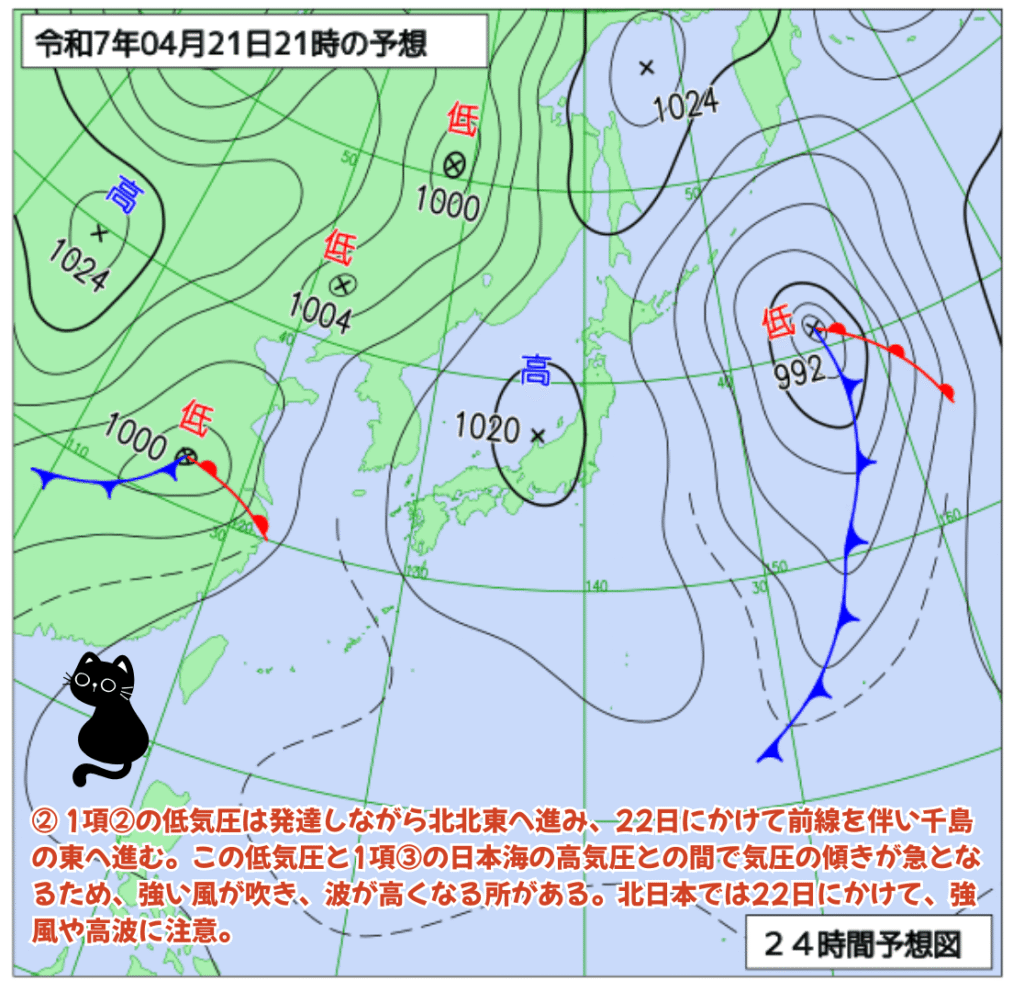 ② 1項②の低気圧は発達しながら北北東へ進み、22日にかけて前線を伴い千島の東へ進む。この低気圧と1項③の日本海の高気圧との間で気圧の傾きが急となるため、強い風が吹き、波が高くなる所がある。北日本では22日にかけて、強風や高波に注意。